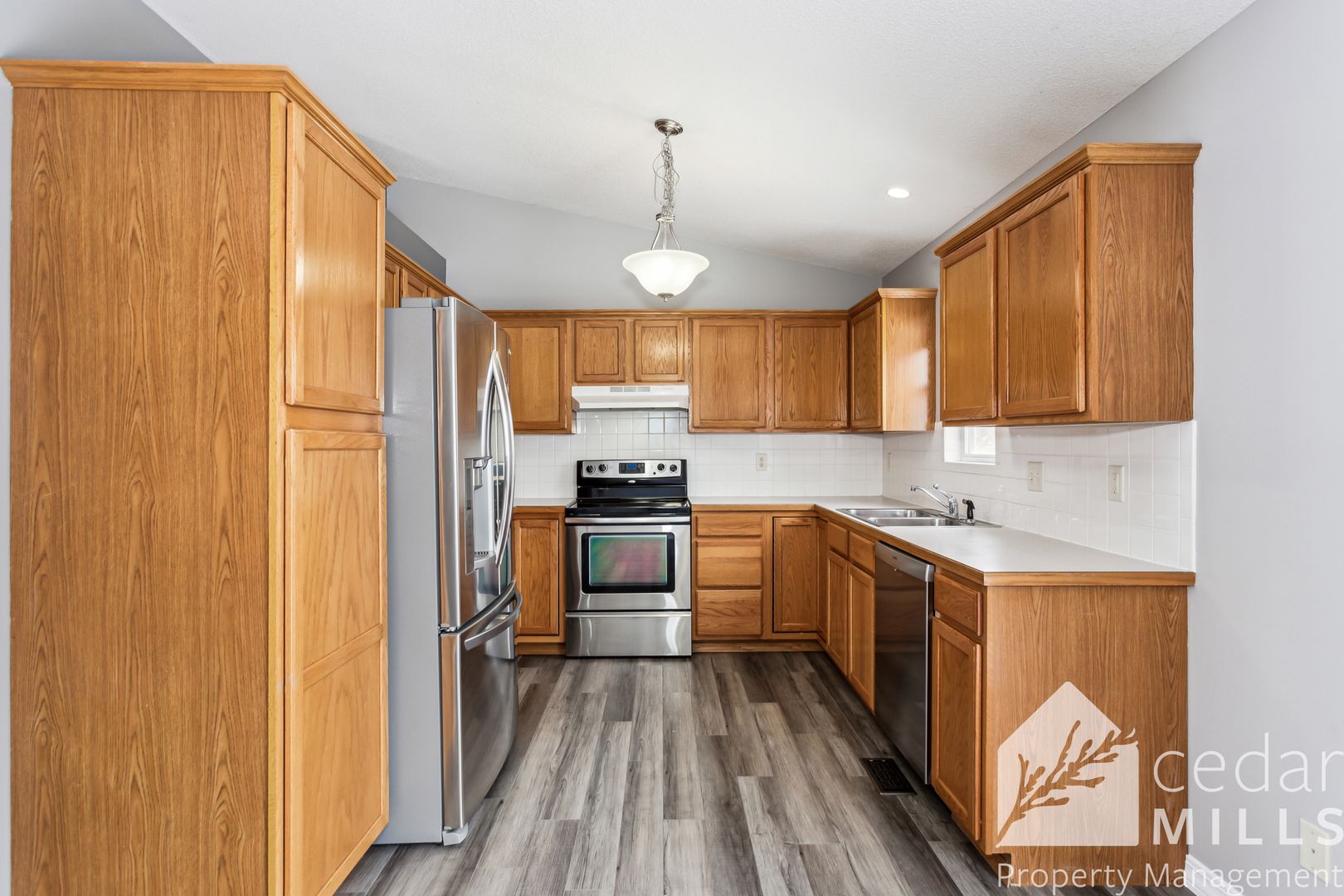 Welcome home to this 4 bed 3 bath, with 3 car garage in Northwest wichita! You're going to love the neighborhood and the curb appeal of this corner lot home. Upstairs You have all hard, luxury plank floors and all new paint. High, vaulted ceilings make the space feel even larger than the square footage. The kitchen has all modern, stainless steel appliances and allows a sufficient space for dining. Through the sliding patio doors, you're greeted with a comfortable completely fenced in yard. The master and 1 of the bedrooms are upstairs, all with hard floors and new paint. The master suite is delightfully roomy and has en suite bathroom and walk in closet. Downstairs is a finished basement with carpeted living room, 3rd and 4th bedrooms and 3rd bath.