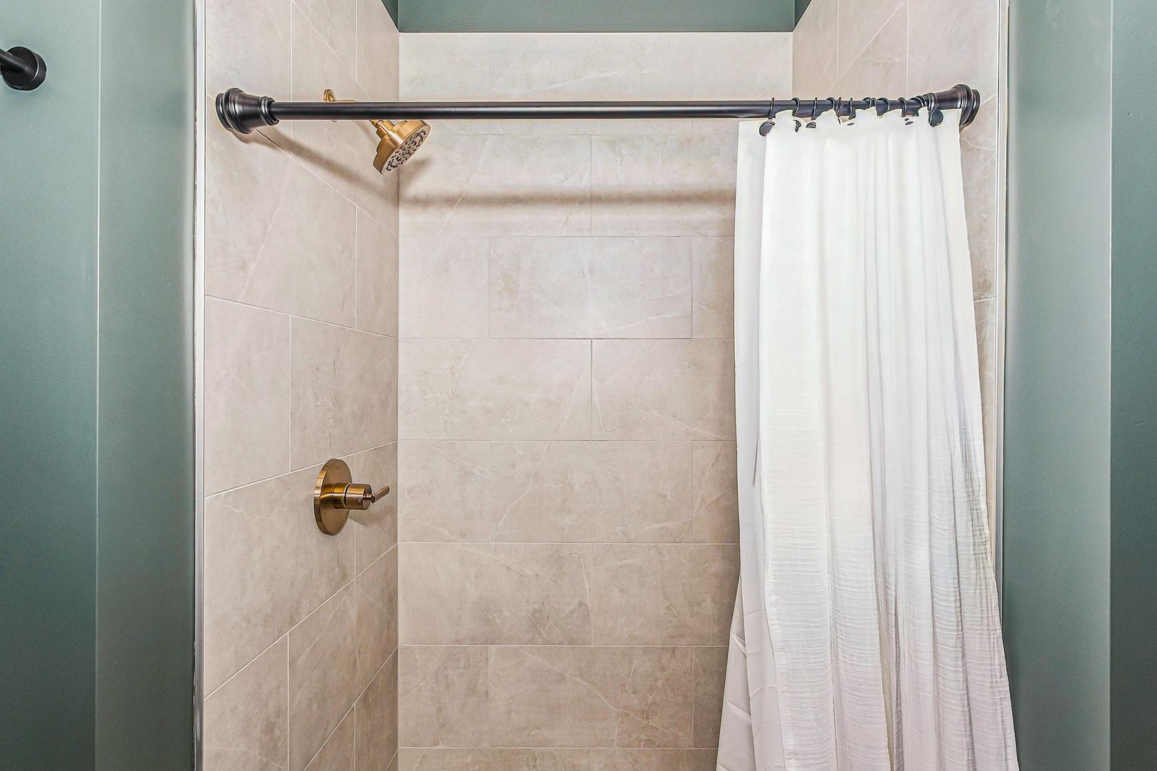 Tiled kitchen backsplash and tiled showers