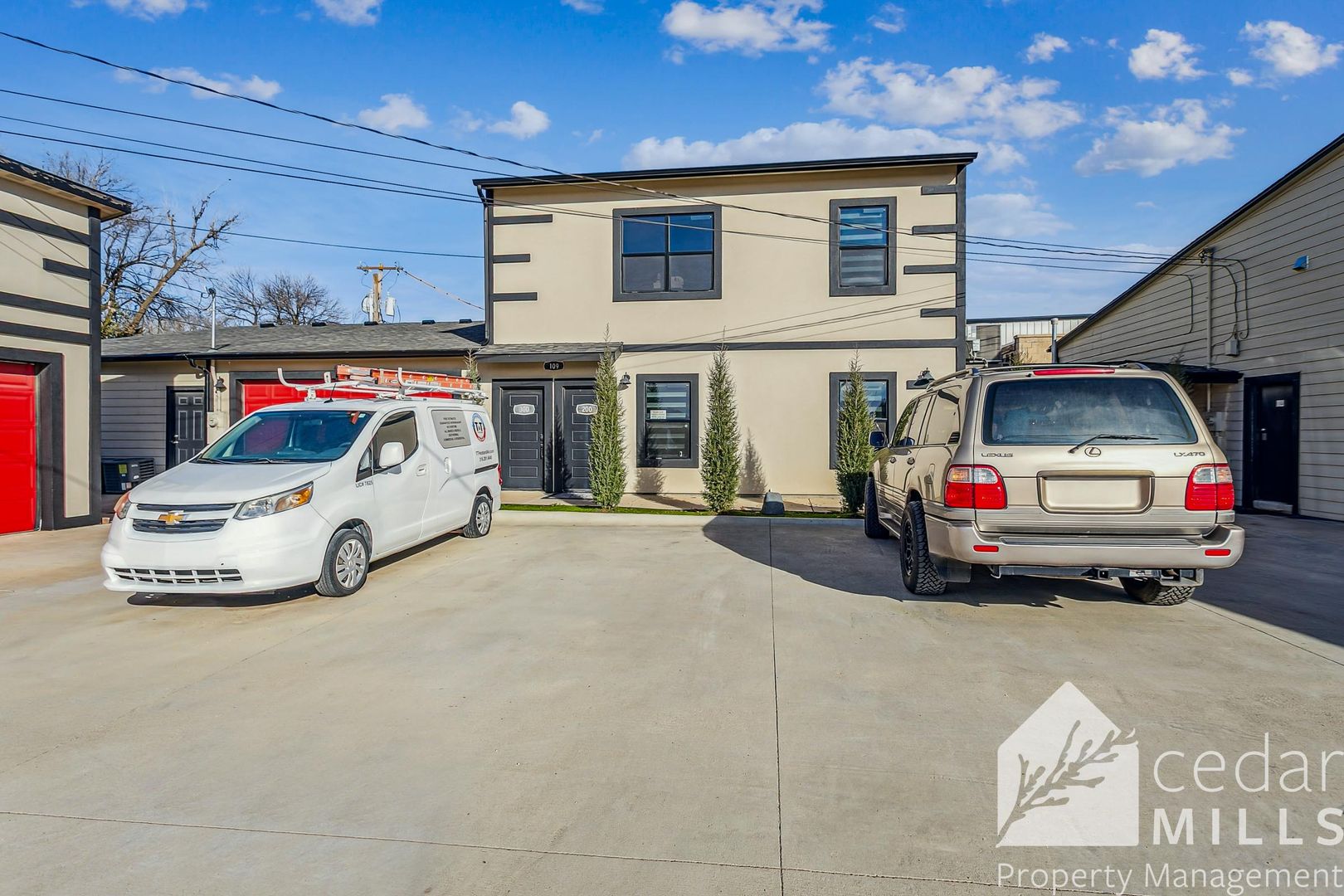 There are two parking stalls in front of the building that are first come, first serve. At no time may any of the single car garages be blocked, the large commercial garage behind store front, nor the parking stall where HVAC service vehicle parks. This area is shared with commercial tenants and is high traffic. No bike riding, playing or loitering should occur in this shared parking area. Tenant may choose the garage option and park in the garage, one of the stalls if available (not reserved) or across the street.